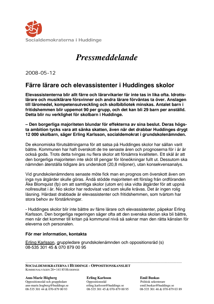 Elevassistenterna blir allt färre och lärarvikarier får inte tas in lika ofta. Idrottslärare och musiklärare försvinner och andra lärare förväntas ta över. Anslagen till läromedel, kompetensutveckling och skolbibliotek minskas. Detta blir nu verklighet för skolbarn i Huddinge.