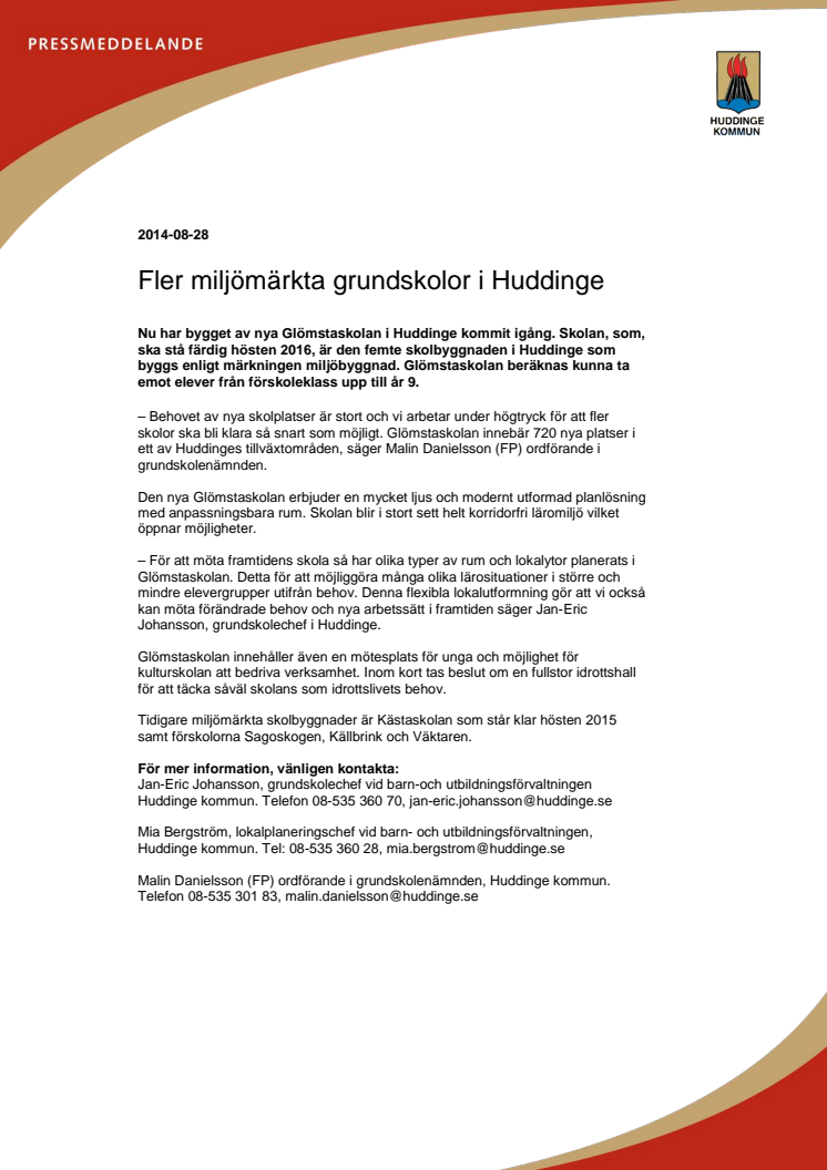 Nu har bygget av nya Glömstaskolan i Huddinge kommit igång. Skolan, som, ska stå färdig hösten 2016, är den femte skolbyggnaden i Huddinge som byggs enligt märkningen miljöbyggnad. Glömstaskolan beräknas kunna ta emot elever från förskoleklass upp till år 9.
