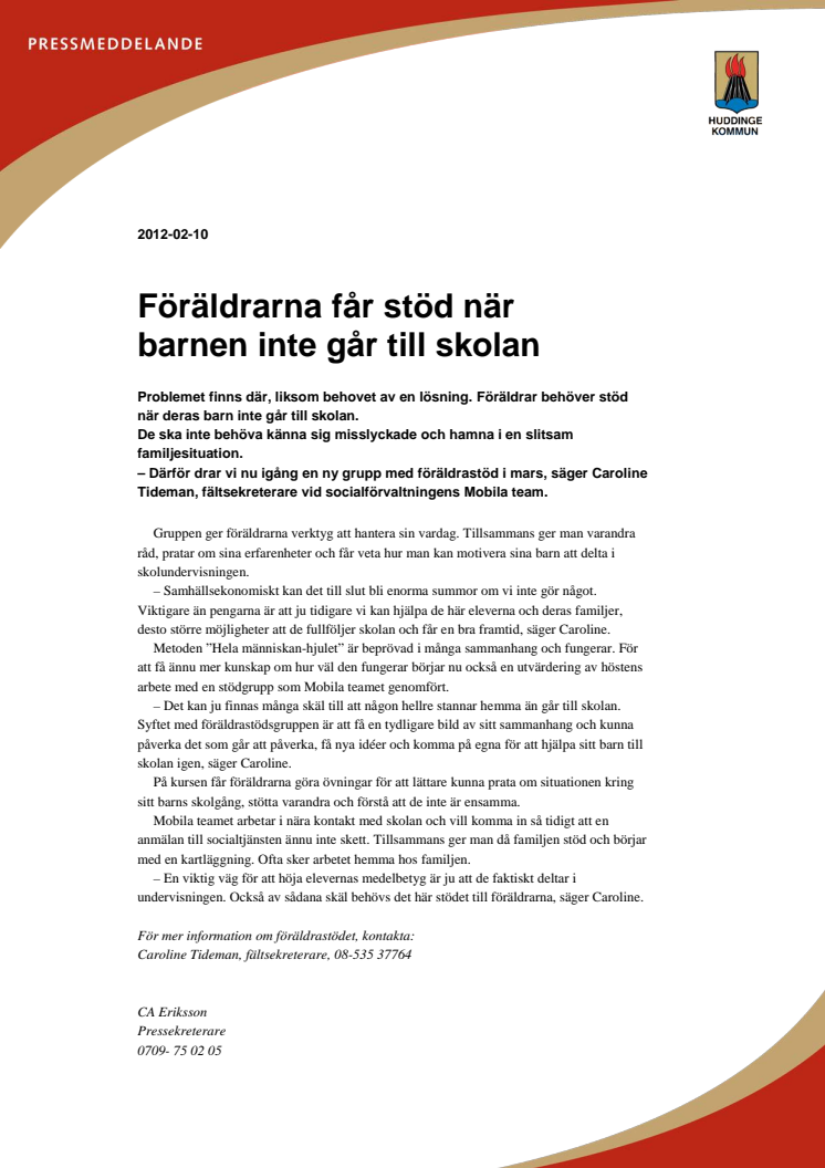 Problemet finns där, liksom behovet av en lösning. Föräldrar behöver stöd när deras barn inte går till skolan. De ska inte behöva känna sig misslyckade och hamna i en slitsam familjesituation. – Därför drar vi nu igång en ny grupp med föräldrastöd i mars, säger Caroline Tideman, fältsekreterare vid socialförvaltningens Mobila team.