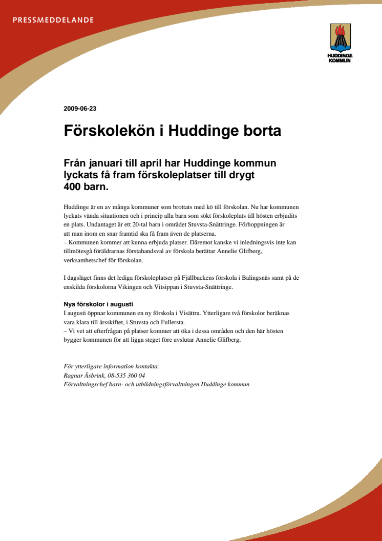 Från januari till april har Huddinge kommun lyckats få fram förskoleplatser till drygt 400 barn.