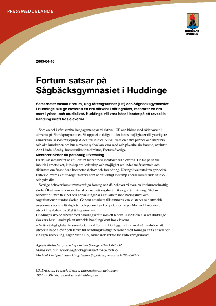 Samarbetet mellan Fortum, Ung företagsamhet (UF) och Sågbäcksgymnasiet i Huddinge ska ge eleverna ett bra nätverk i näringslivet, mentorer en bra start i yrkes- och studielivet. Huddinge vill vara bäst i landet på att utveckla handlingskraft hos eleverna.