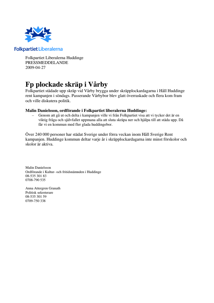 Folkpartiet städade Vårby under Håll Huddinge rentkampanjen.