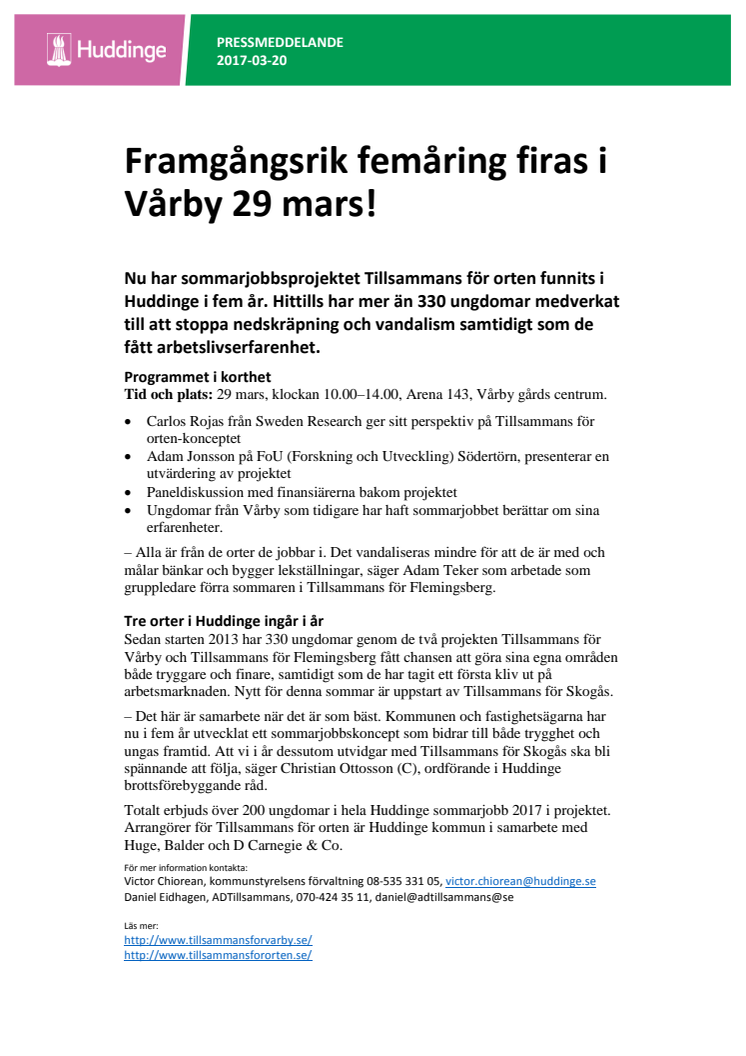 Nu har sommarjobbsprojektet Tillsammans för orten funnits i Huddinge i fem år. Hittills har mer än 330 ungdomar medverkat till att stoppa nedskräpning och vandalism samtidigt som de fått arbetslivserfarenhet. I år erbjuds över 200 ungdomar i hela Huddinge sommarjobb i projektet. Arrangörer för Tillsammans för orten är Huddinge kommun i samarbete med Huge, Balder och D Carnegie & Co.