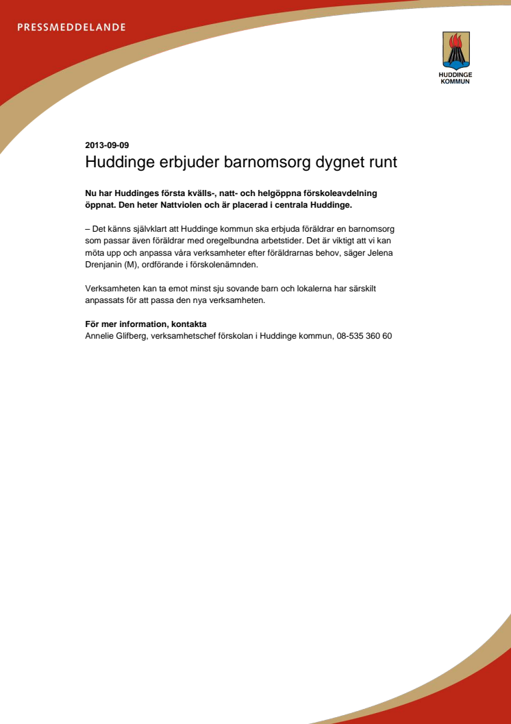 Nu har Huddinges första kvälls-, natt- och helgöppna förskoleavdelning öppnat. Den heter Nattviolen och är placerad i centrala Huddinge.