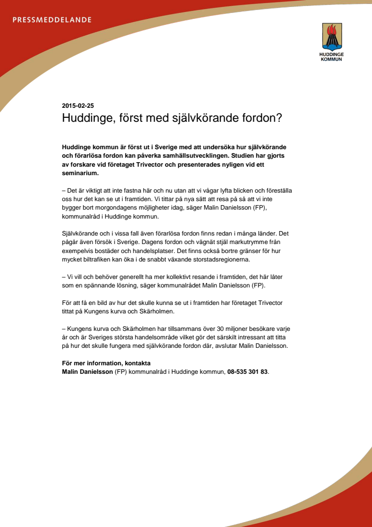 Huddinge kommun är först ut i Sverige med att undersöka hur självkörande och förarlösa fordon kan påverka samhällsutvecklingen. Studien har gjorts av forskare vid företaget Trivector och presenterades nyligen vid ett seminarium.