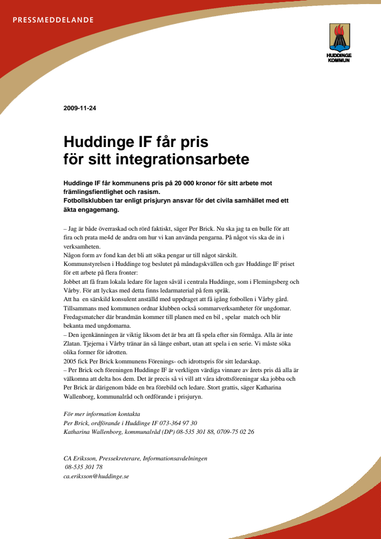 Huddinge IF får kommunens pris på 20000 kronor för sitt arbete mot främlingsfientlighet och rasism.
