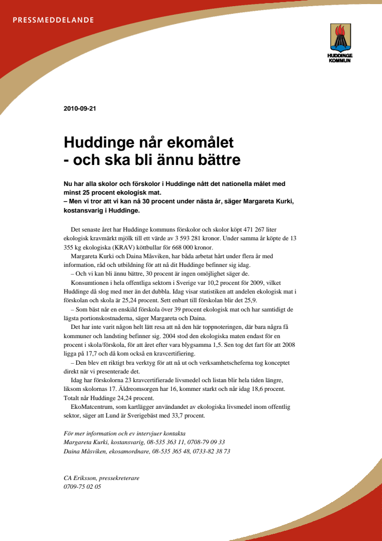 Nu har alla kommunala skolor och förskolor i Huddinge nått det nationella målet med minst 25 procent ekologisk mat.