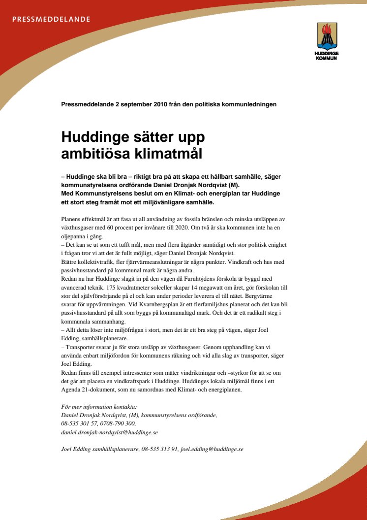 Med Kommunstyrelsens beslut om en Klimat- och energiplan tar Huddinge ett stort steg framåt mot ett miljövänligare samhälle.