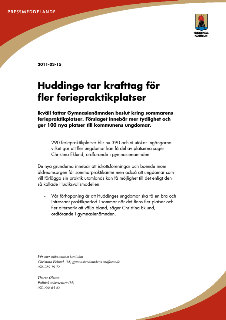 Ikväll fattar Gymnasienämnden beslut kring sommarens feriepraktikplatser. Förslaget innebär mer tydlighet och ger 100 nya platser till kommunens ungdomar. De nya grunderna innebär att idrottsföreningar och boende inom äldreomsorgen får sommarpraktikanter men också att ungdomar som vill förlägga sin praktik utomlands kan få möjlighet till det.