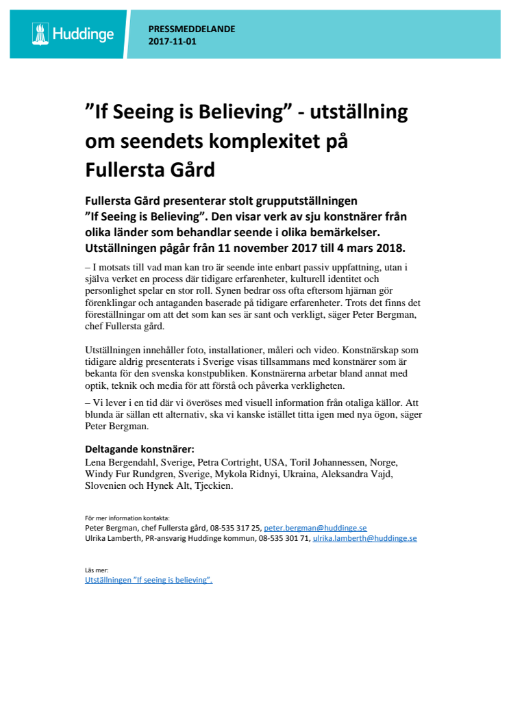 If Seeing is Believing”. Den visar verk av sju konstnärer från olika länder som behandlar seende i olika bemärkelser. Utställningen pågår från 11 november 2017 till 4 mars 2018.