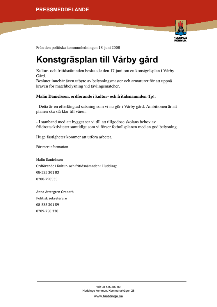 Kultur- och fritidsnämnden beslutade den 17 juni om en konstgräsplan i Vårby Gård.