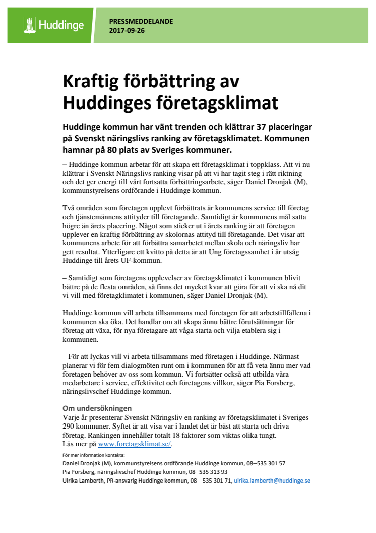 Huddinge kommun har vänt trenden och klättrar 37 placeringar på Svenskt näringslivs ranking av företagsklimatet. Kommunen hamnar på 80 plats av Sveriges kommuner.