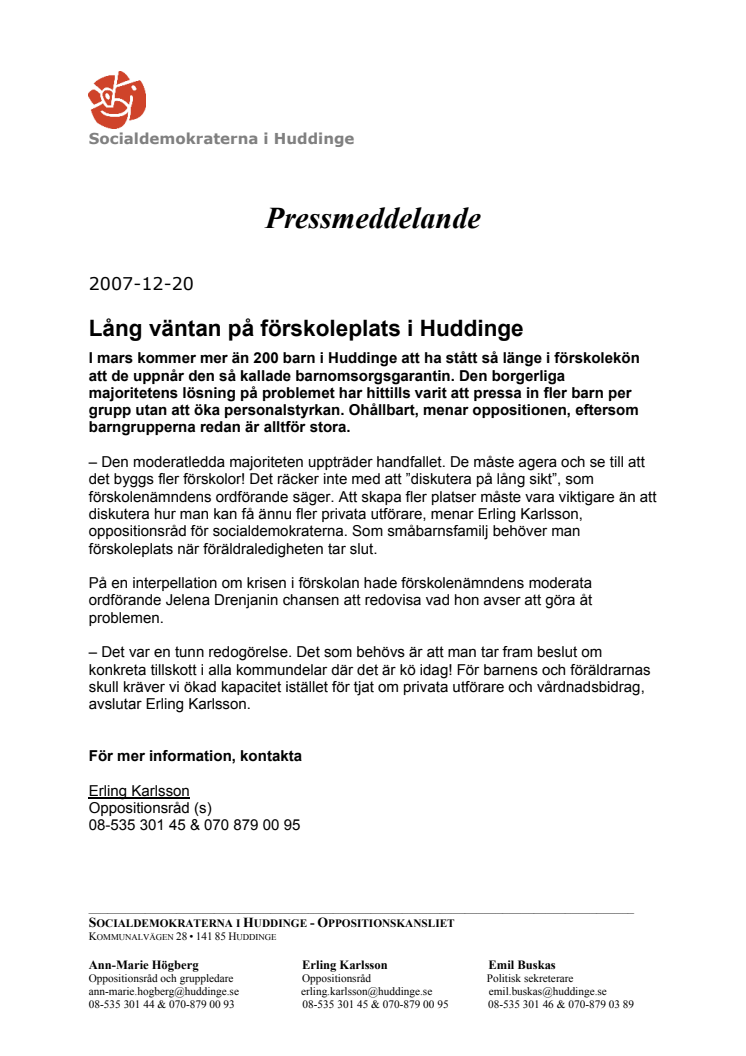 I mars kommer mer än 200 barn i Huddinge att ha stått så länge i förskolekön att de uppnår den så kallade barnomsorgsgarantin. Den borgerliga majoritetens lösning på problemet har hittills varit att pressa in fler barn per grupp utan att öka personalstyrkan. Ohållbart, menar oppositionen, eftersom barngrupperna redan är alltför stora.