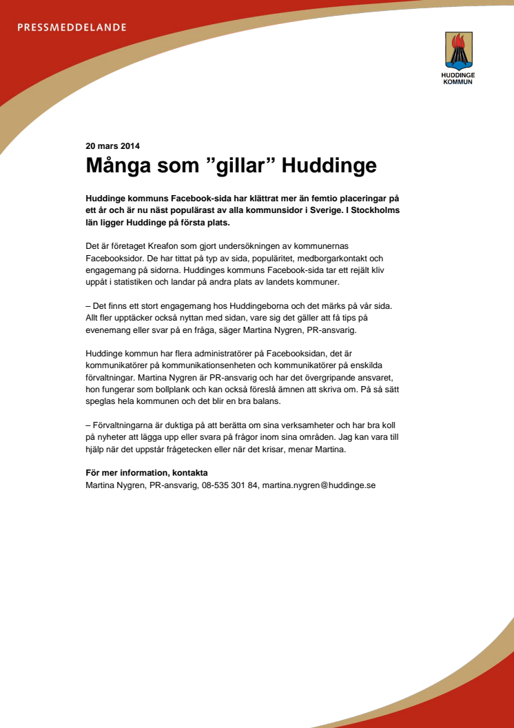 Huddinge kommuns Facebook-sida har klättrat mer än femtio placeringar på ett år och är nu näst populärast av alla kommunsidor i Sverige. I Stockholms län ligger Huddinge på första plats.