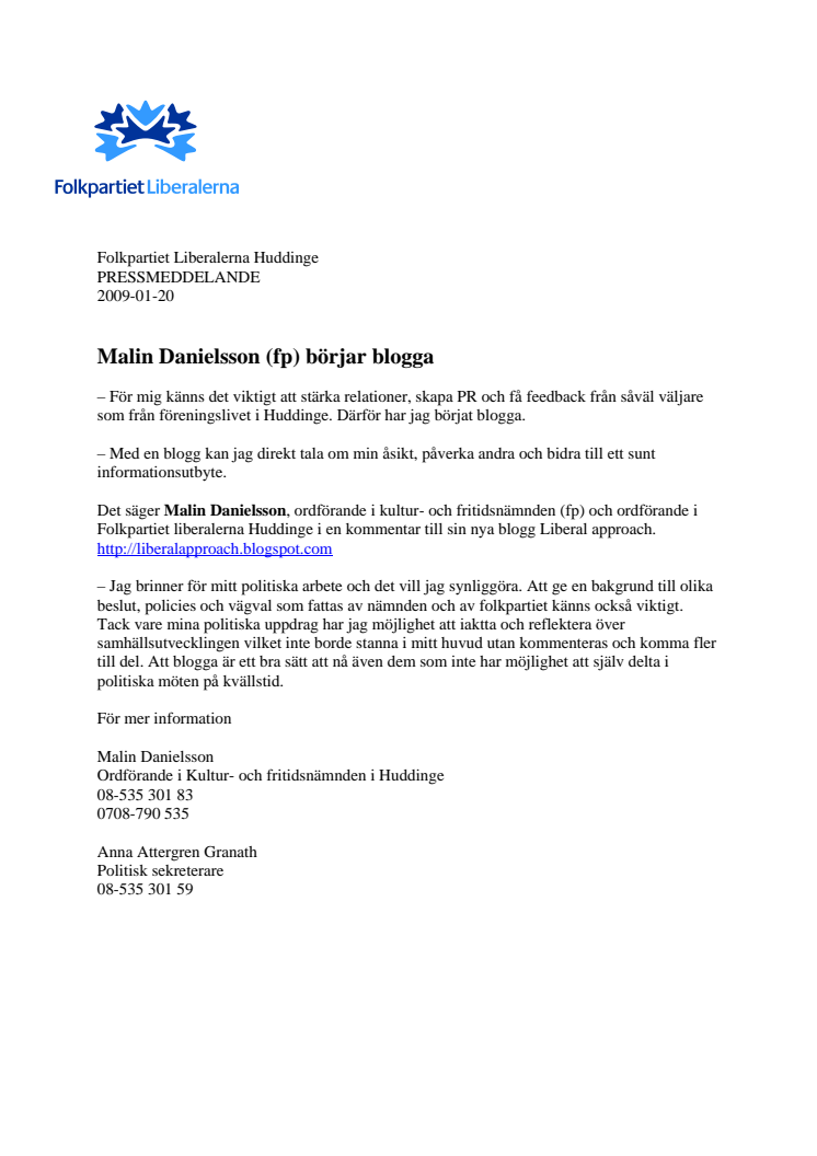 Malin Danielsson, ordförande i kultur- och fritidsnämnden och Folkpartiet liberalerna Huddinge har börjat blogga.