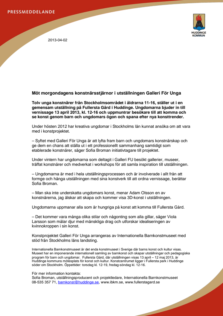 Tolv unga konstnärer från Stockholmsområdet i åldrarna 11-16, ställer ut i en gemensam utställning på Fullersta Gård i Huddinge. Ungdomarna bjuder in till vernissage 13 april 2013, kl. 12-16 och uppmuntrar besökare till att komma och se konst genom barn och ungdomars ögon och spana efter nya konsttrender.