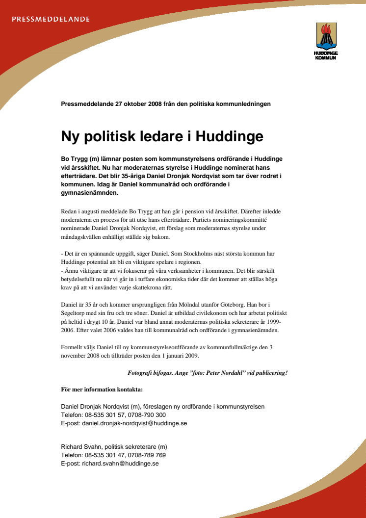 Bo Trygg (m) lämnar posten som kommunstyrelsens ordförande i Huddinge vid årsskiftet. Nu har moderaternas styrelse i Huddinge nominerat hans efterträdare. Det blir 35-åriga Daniel Dronjak Nordqvist som tar över rodret i kommunen. Idag är Daniel kommunalråd och ordförande i gymnasienämnden.