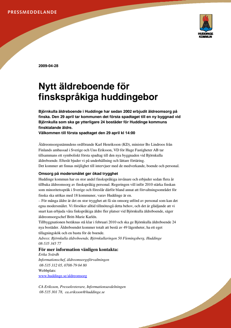 Björnkulla äldreboende i Huddinge har sedan 2002 erbjudit äldreomsorg på finska. Den 29 april tar kommunen det första spadtaget till en ny byggnad vid Björnkulla som ska ge ytterligare 24 bostäder för Huddinge kommuns finsktalande äldre.