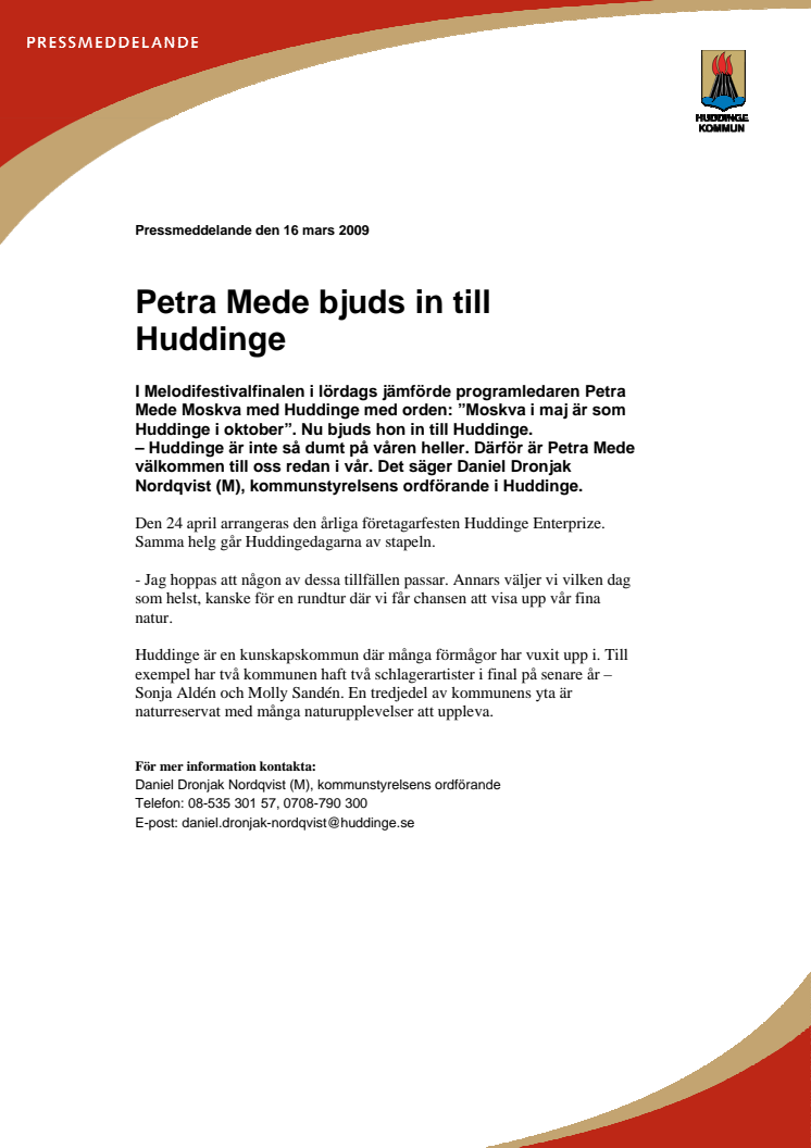 I Melodifestivalfinalen i lördags jämförde programledaren Petra Mede Moskva med Huddinge med orden: ”Moskva i maj är som Huddinge i oktober”. Nu bjuds hon in till Huddinge. – Huddinge är inte så dumt på våren heller. Därför är Petra Mede välkommen till oss redan i vår. Det säger Daniel Dronjak Nordqvist (M), kommunstyrelsens ordförande i Huddinge.