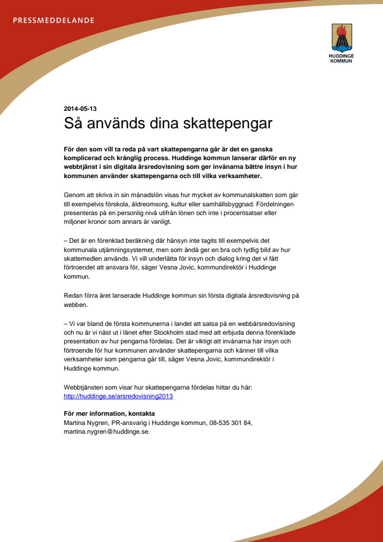 För den som vill ta reda på vart skattepengarna går är det en ganska komplicerad och krånglig process. Huddinge kommun lanserar därför en ny webbtjänst i sin digitala årsredovisning som ger invånarna bättre insyn i hur kommunen använder skattepengarna och till vilka verksamheter.