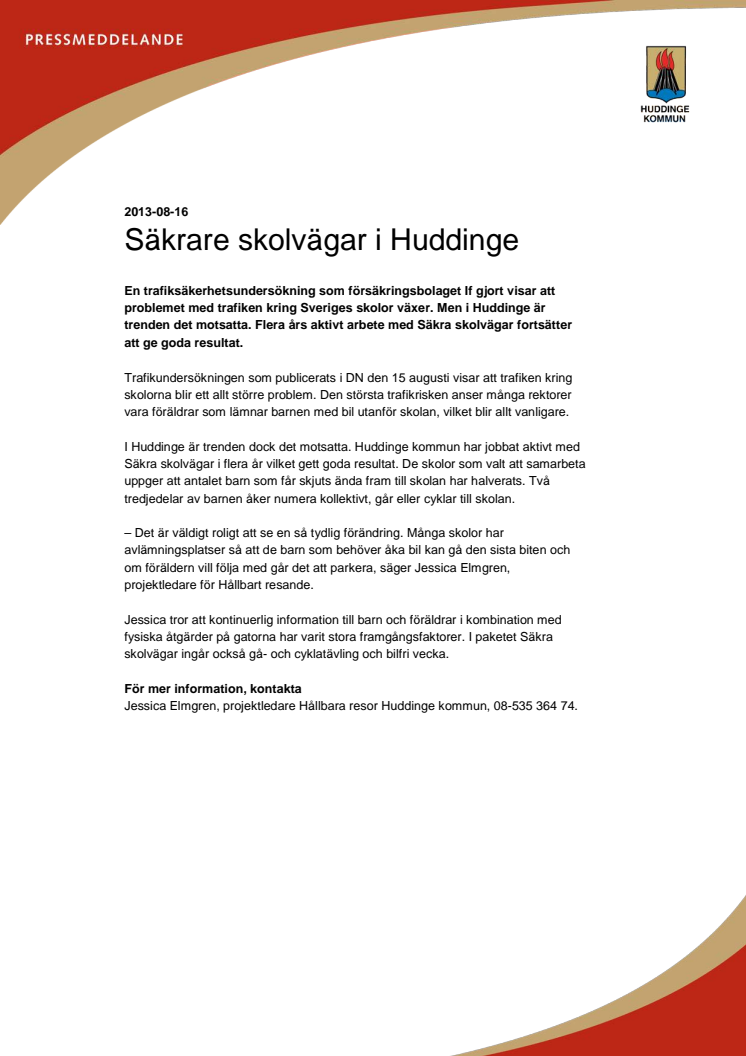En trafiksäkerhetsundersökning som försäkringsbolaget If gjort visar att problemet med trafiken kring Sveriges skolor växer. Men i Huddinge är trenden det motsatta. Flera års aktivt arbete med Säkra skolvägar fortsätter att ge goda resultat.