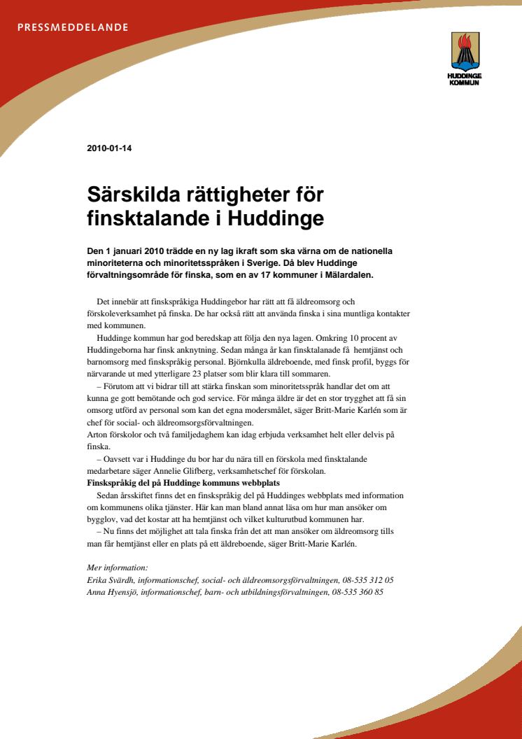 Den 1 januari 2010 trädde en ny lag ikraft som ska värna om de nationella minoriteterna och minoritetsspråken i Sverige. Då blev Huddinge förvaltningsområde för finska, som en av 17 kommuner i Mälardalen.