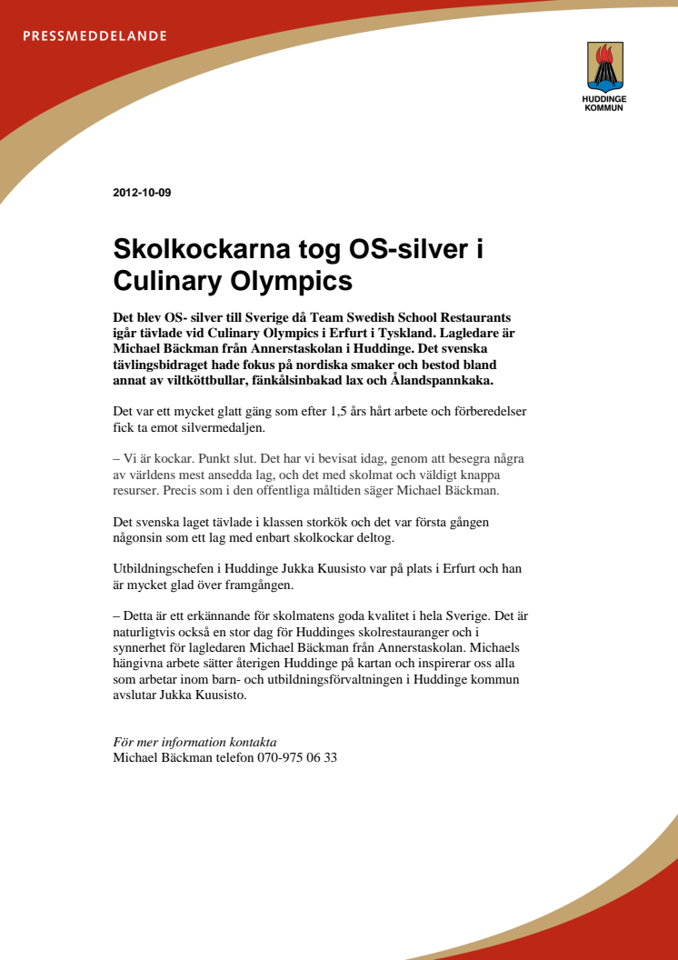 Det blev OS-silver till Sverige då Team Swedish School Restaurants igår tävlade vid Culinary Olympics i Erfurt i Tyskland. Lagledare är Michael Bäckman från Annerstaskolan i Huddinge. Det svenska tävlingsbidraget hade fokus på nordiska smaker och bestod bland annat av viltköttbullar, fänkålsinbakad lax och Ålandspannkaka.