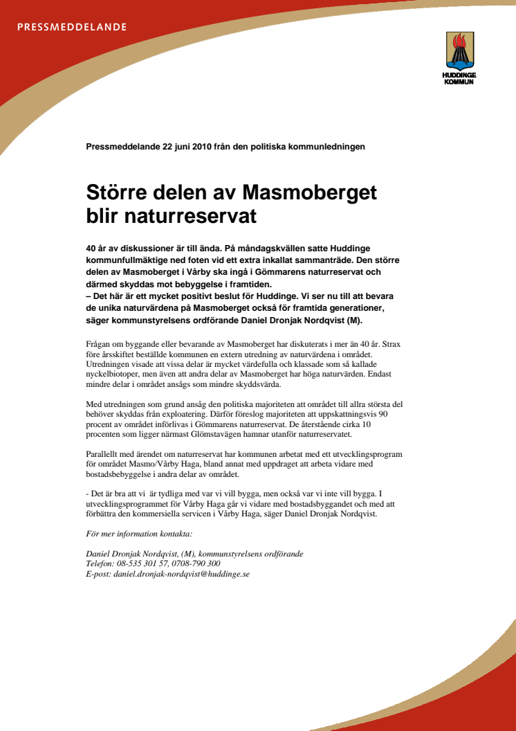 40 år av diskussioner är till ända. På måndagskvällen satte Huddinge kommunfullmäktige ned foten vid ett extra inkallat sammanträde. Den större delen av Masmoberget i Vårby ska ingå i Gömmarens naturreservat och därmed skyddas mot bebyggelse i framtiden.