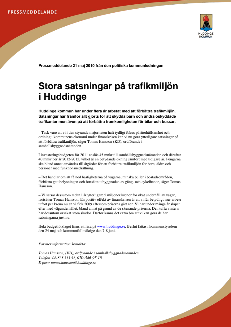 Huddinge kommun fortsätter sitt arbete med att förbättra trafikmiljön. I investeringsbudgeten för 2011 anslås 45 mnkr till samhällsbyggnadsnämnden och därefter 40 mnkr per år 2012-2013, vilket är en betydande ökning jämfört med tidigare år. Ytterligare 5 miljoner kronor avsätts redan i år för ökat underhåll av vägar.