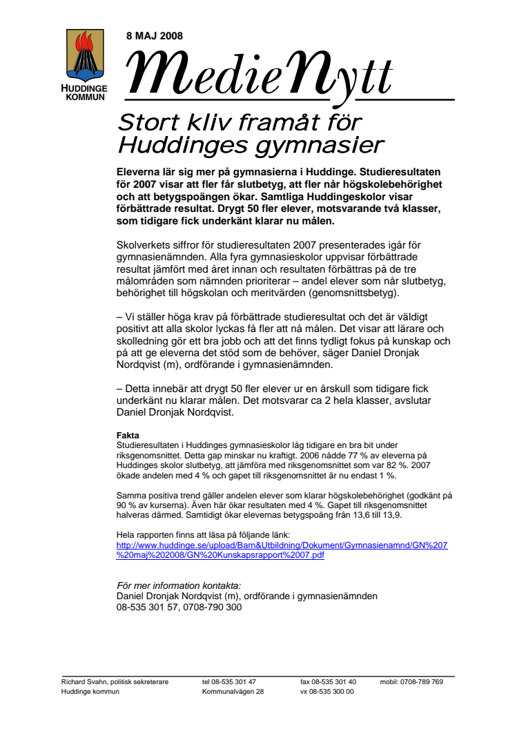 Eleverna lär sig mer på gymnasierna i Huddinge. Studieresultaten för 2007 visar att fler får slutbetyg, att fler når högskolebehörighet och att betygspoängen ökar. Samtliga Huddingeskolor visar förbättrade resultat. Drygt 50 fler elever, motsvarande två klasser, som tidigare fick underkänt klarar nu målen.