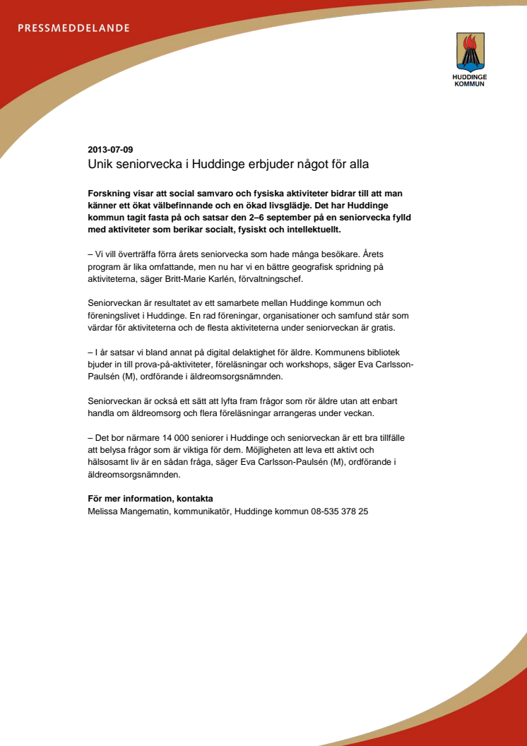 Forskning visar att social samvaro och fysiska aktiviteter bidrar till att man känner ett ökat välbefinnande och en ökad livsglädje. Det har Huddinge kommun tagit fasta på och satsar den 2–6 september på en seniorvecka fylld med aktiviteter som berikar socialt, fysiskt och intellektuellt.