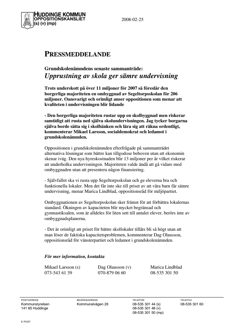 Trots underskott på över 11 miljoner för 2007 så föreslår den borgerliga majoriteten i Huddinge en ombyggnad av Segeltorpsskolan för 206 miljoner. Oansvarigt och orimligt anser oppositionen som menar att kvaliteten i undervisningen blir lidande