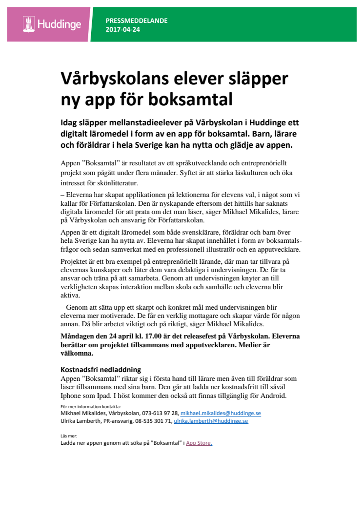 Idag släpper mellanstadieelever på Vårbyskolan i Huddinge ett digitalt läromedel i form av en app för boksamtal. Barn, lärare och föräldrar i hela Sverige kan ha nytta och glädje av appen.
