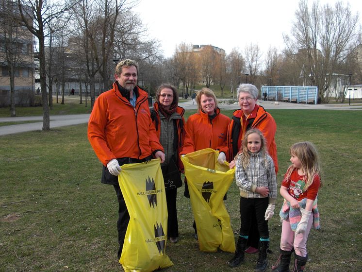 FP städar i Huddinge centrum under Håll Huddinge Rent veckan. På bilden: Tomas och Helena Nimreus Silfverswärd med familj, Malin Danielsson, kommunalråd och Lena Lionskoog.