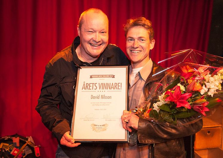Nils Landgren tillsammans med vinnaren David Nilsson i Huddinge Music Challenge. Fotograf: Per Mikaelsson, Meritzo.