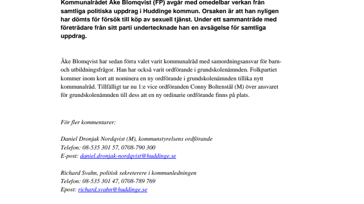 Kommunalrådet Åke Blomqvist (FP) avgår med omedelbar verkan från samtliga politiska uppdrag i Huddinge kommun. Orsaken är att han nyligen har dömts för försök till köp av sexuell tjänst. Under ett sammanträde med företrädare från sitt parti undertecknade han en avsägelse för samtliga uppdrag.