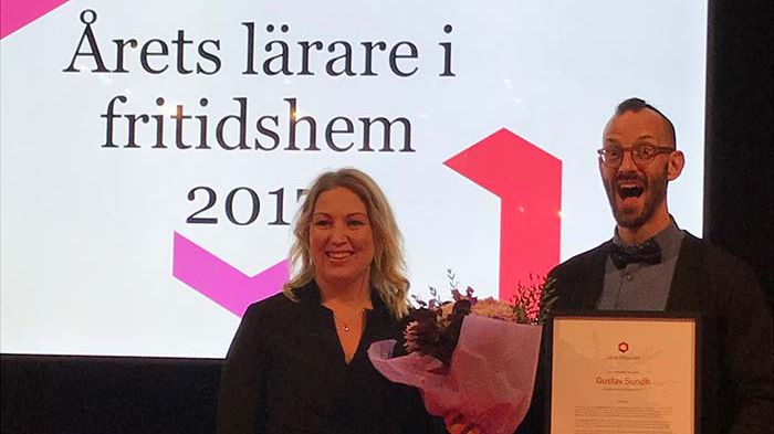 Gustav Sundh, fritidspedagog på Glömstaskolan i Huddinge, är årets lärare i fritidshem. Han får priset för sitt engagemang för det fritidspedagogiska lärandet och det utvecklingsarbete som han driver både lokalt och nationellt via sociala medier.