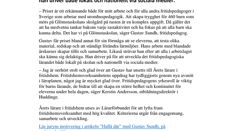 – Jag är oerhört stolt och glad över att Gustav har utsetts till Årets lärare i fritidshem. Fritidshemsverksamhetens uppdrag har tydliggjorts genom nya avsnitt i läroplanen, något jag är mycket glad över. Fritidspedagogens yrkesroll är viktig för barns lärande, de bidrar till att skapa en större helhet och kontinuitet för eleverna under hela dagen, säger Kerstin Andersson, utbildningsdirektör i Huddinge.