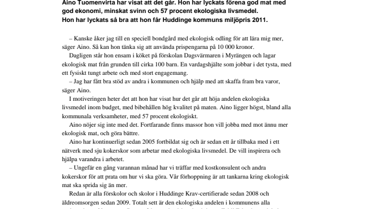I motiveringen heter det att hon har visat hur det går att höja andelen ekologiska livsmedel inom budget, med bibehållen hög kvalitet på maten. Aino ligger högst, bland alla kommunala verksamheter, med 57 procent ekologiskt.