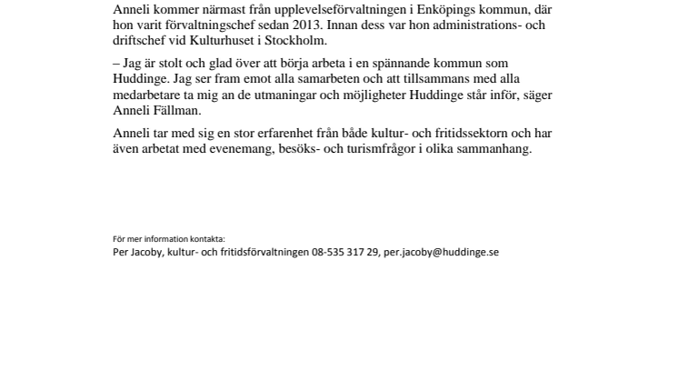 – Jag är stolt och glad över att börja arbeta i en spännande kommun som Huddinge. Jag ser fram emot alla samarbeten och att tillsammans med alla medarbetare ta mig an de utmaningar och möjligheter Huddinge står inför, säger Anneli Fällman.