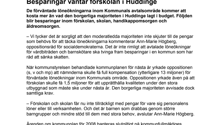 De förväntade löneökningarna inom Kommunals avtalsområde kommer att kosta mer än vad den borgerliga majoriteten i Huddinge lagt i budget. Följden blir besparingar inom förskolan, skolan, handikappomsorgen och äldreomsorgen.
