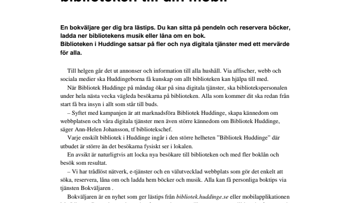 Bokväljaren är en nyhet som ger lästips från bibliotek.huddinge.se eller mobilapplikationen My Library. Det är lätt att lägga in några punkter om vilken genre man vill läsa i, något om sig själv och därefter få ett antal boktitlar/författare som kan vara intressanta.
