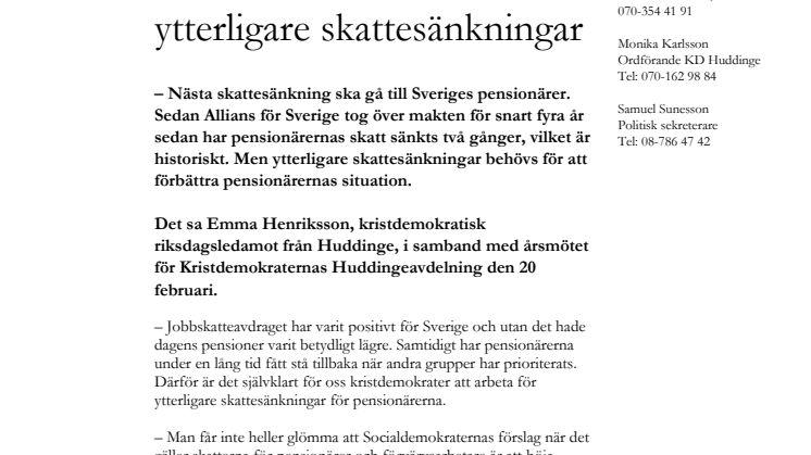 – Nästa skattesänkning ska gå till Sveriges pensionärer. Sedan Allians för Sverige tog över makten för snart fyra år sedan har pensionärernas skatt sänkts två gånger, vilket är historiskt. Men ytterligare skattesänkningar behövs för att förbättra pensionärernas situation. Det sa Emma Henriksson, kristdemokratisk riksdagsledamot från Huddinge, i samband med årsmötet för Kristdemokraternas Huddingeavdelning den 20 februari.