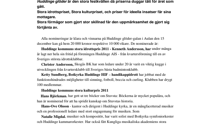 Alla nomineringar är klara och vinnarna på Huddinge glöder-galan i Aulan den 15 december kan gå hem 20 000 kronor respektive 10 000 rikare. De nominerade är: