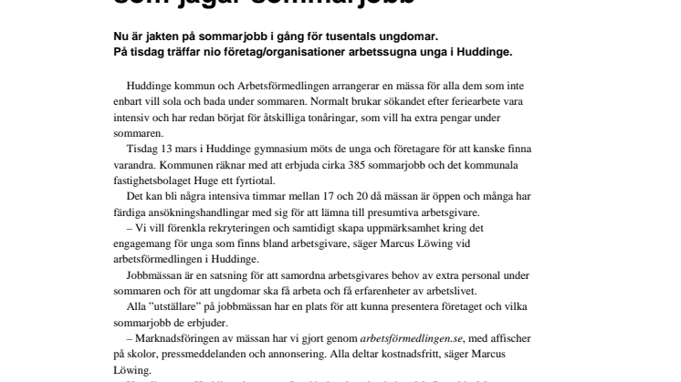 Huddinge kommun och Arbetsförmedlingen arrangerar en mässa för alla dem som inte enbart vill sola och bada under sommaren. Normalt brukar sökandet efter feriearbete vara intensiv och har redan börjat för åtskilliga tonåringar, som vill ha extra pengar under sommaren.