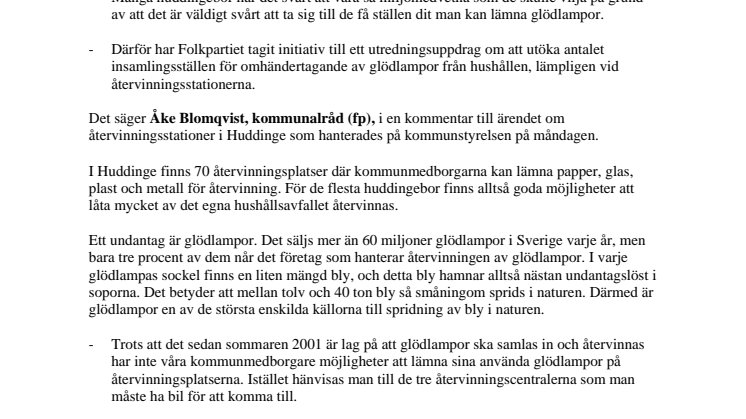 - Många huddingebor har det svårt att vara så miljömedvetna som de skulle vilja på grund av att det är väldigt svårt att ta sig till de få ställen dit man kan lämna glödlampor. - Därför har Folkpartiet tagit initiativ till ett utredningsuppdrag om att utöka antalet insamlingsställen för omhändertagande av glödlampor från hushållen, lämpligen vid återvinningsstationerna. Det säger Åke Blomqvist, kommunalråd (fp), i en kommentar till ärendet om återvinningsstationer i Huddinge som hanterades på kommunstyrelsen på måndagen. I Huddinge finns 70 återvinningsplatser där kommunmedborgarna kan lämna papper, glas, plast och metall för återvinning. För de flesta huddingebor finns alltså goda möjligheter att låta mycket av det egna hushållsavfallet återvinnas. Ett undantag är glödlampor. Det säljs mer än 60 miljoner glödlampor i Sverige varje år, men bara tre procent av dem når det företag som hanterar återvinningen av glödlampor. I varje glödlampas sockel finns en liten mängd bly, och detta bly hamnar alltså nästan undantagslöst i soporna. Det betyder att mellan tolv och 40 ton bly så småningom sprids i naturen. Därmed är glödlampor en av de största enskilda källorna till spridning av bly i naturen. - Trots att det sedan sommaren 2001 är lag på att glödlampor ska samlas in och återvinnas har inte våra kommunmedborgare möjligheter att lämna sina använda glödlampor på återvinningsplatserna. Istället hänvisas man till de tre återvinningscentralerna som man måste ha bil för att komma till. - Det är rimligt att anta att detta negativt påverkar kommuninvånarnas benägenhet att lämna in använda glödlampor till återvinning, vilket direkt leder till att bly sprids i kommunen, avslutar Åke Blomqvist.