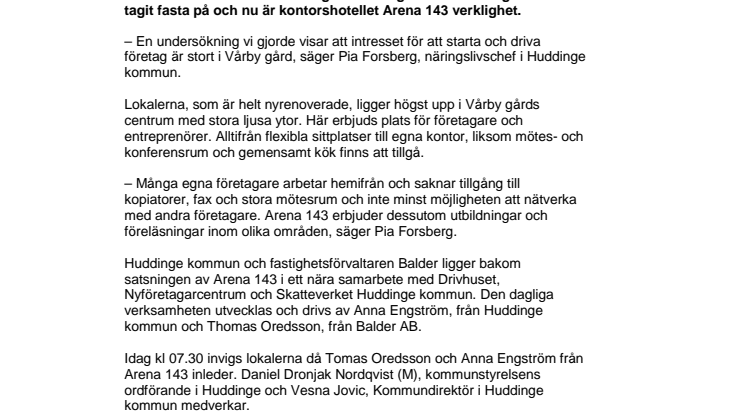 För mer information kontakta: Pia Forsberg, näringslivschef i Huddinge kommun, 08-535 313 93. info@arena143.se www.arena143.se facebook.com/arena143