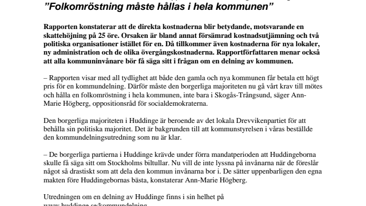 – Rapporten visar med all tydlighet att både den gamla och nya kommunen får betala ett högt pris för en kommundelning. Därför måste den borgerliga majoriteten nu gå vårt krav till mötes och hålla en folkomröstning i hela kommunen, inte bara i Skogås-Trångsund, säger Ann-Marie Högberg, oppositionsråd för socialdemokraterna.