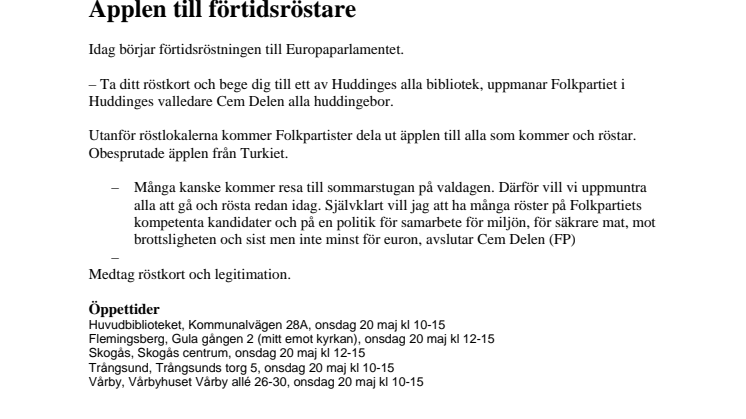 - Ta ditt röstkort och bege dig till ett av Huddinges alla bibliotek, uppmanar Folkpartiet i Huddinges valledare Cem Delen alla huddingebor.
