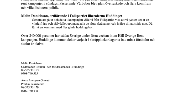 - Genom att gå ut och delta i kampanjen ville vi från Folkpartiet visa att vi tycker det är en viktig fråga och självfallet uppmana alla att sluta skräpa ner och hjälpa till att städa upp. Då får vi en kommun med fler glada huddingebor.